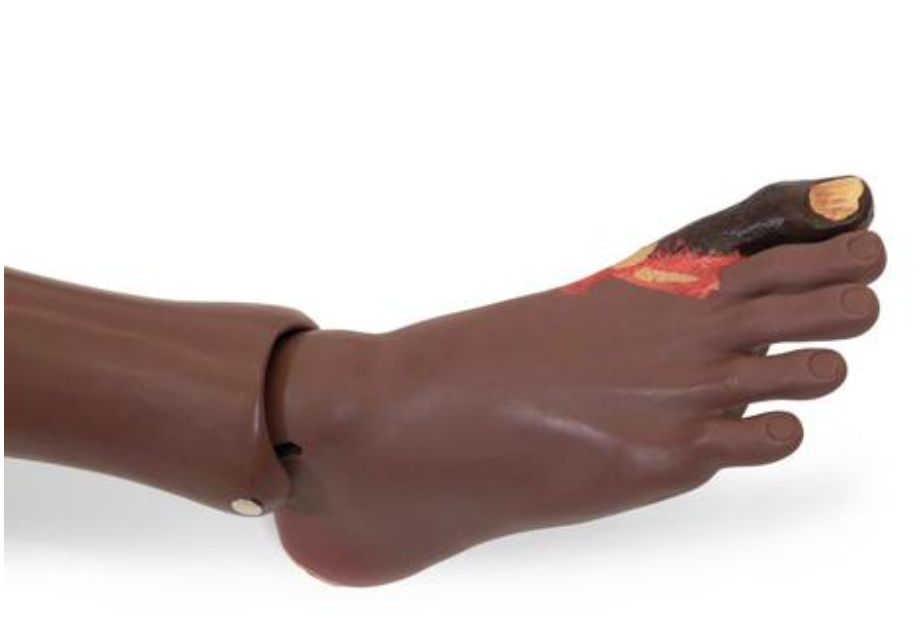 Für die Ausbildung in der Diabetespflege wurde ein spezielles Fußsyndrom-Modul integriert, das die charakteristischen Komplikationen dieser Erkrankung naturgetreu simuliert. Zusätzlich können verschiedene chirurgische Wundverschlüsse wie Klammernähte sowie traumatische Verletzungen wie Riss- und Schürfwunden für die Wundversorgung trainiert werden.
