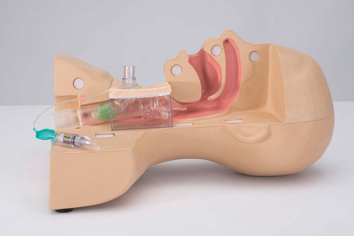 Auch die Position des Absaugkatheters lässt sich dank der durchsichtigen Trachea genau bestimmen. Damit können Sie die Absaugung mit dem oberen Teil des Cuffs trainieren. Der mitgelieferte künstliche Schleim sorgt dafür, dass die Trainingssituation noch realistischer wirkt.
